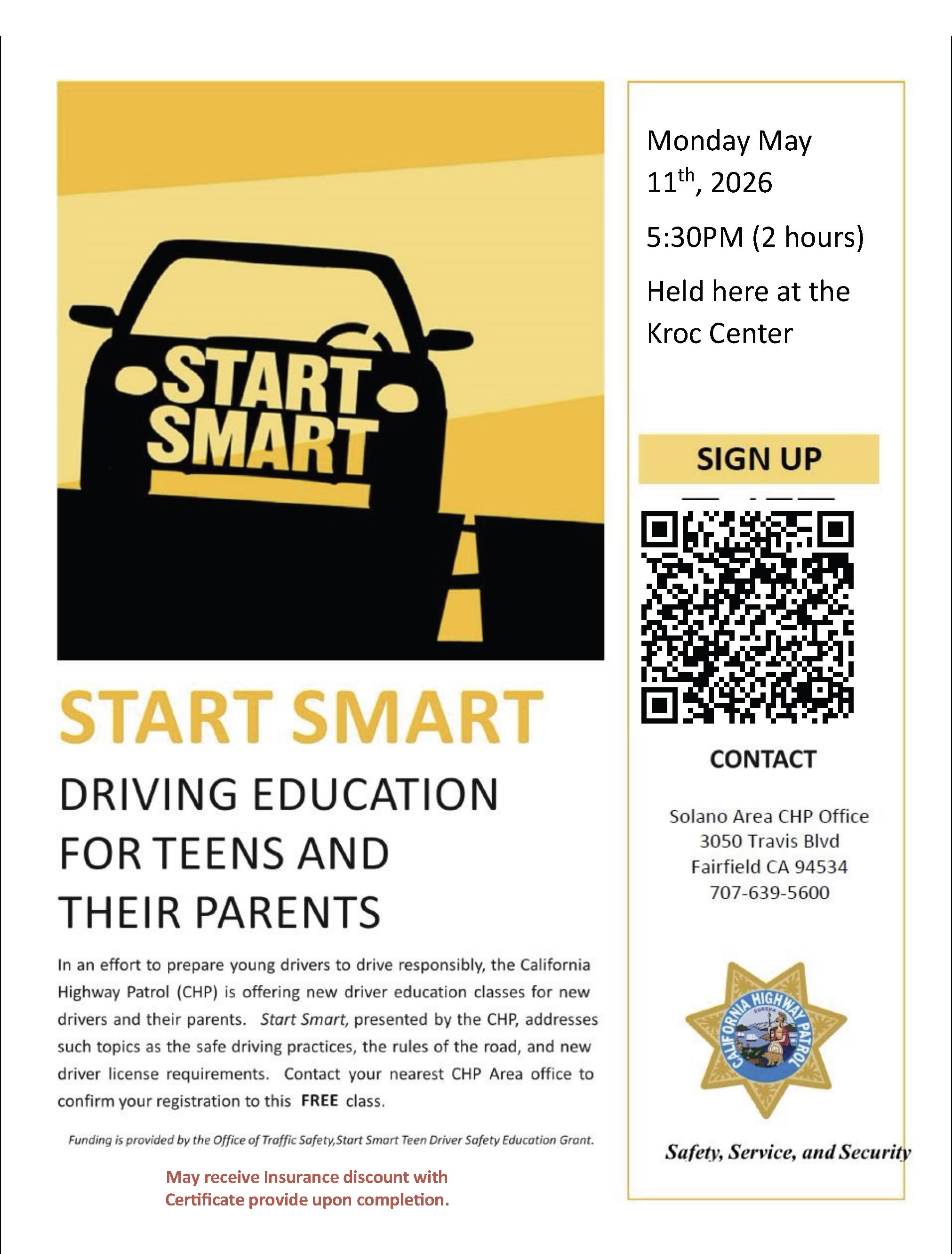 In partnership with the California Highway Patrol, this informative program helps teens build safe driving habits while giving parents valuable insight into the responsibilities and risks of the road. Learn practical tips, safety strategies, and what it takes to become a confident, responsible driver.